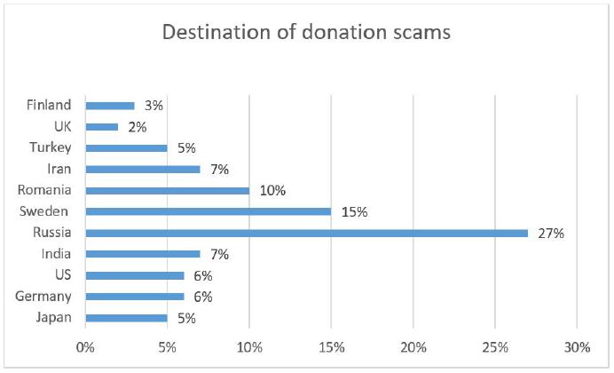 27 Prozent der Adressaten der Spam-Mails waren Inboxen in Russland, gefolgt von Ländern wie Schweden, Rumänien, Iran und Indien. Aber auch in westliche Industrieländer wie die USA, Japan, Deutschland oder Großbritannien verschicken die digitalen Betrüger ihre Mails.