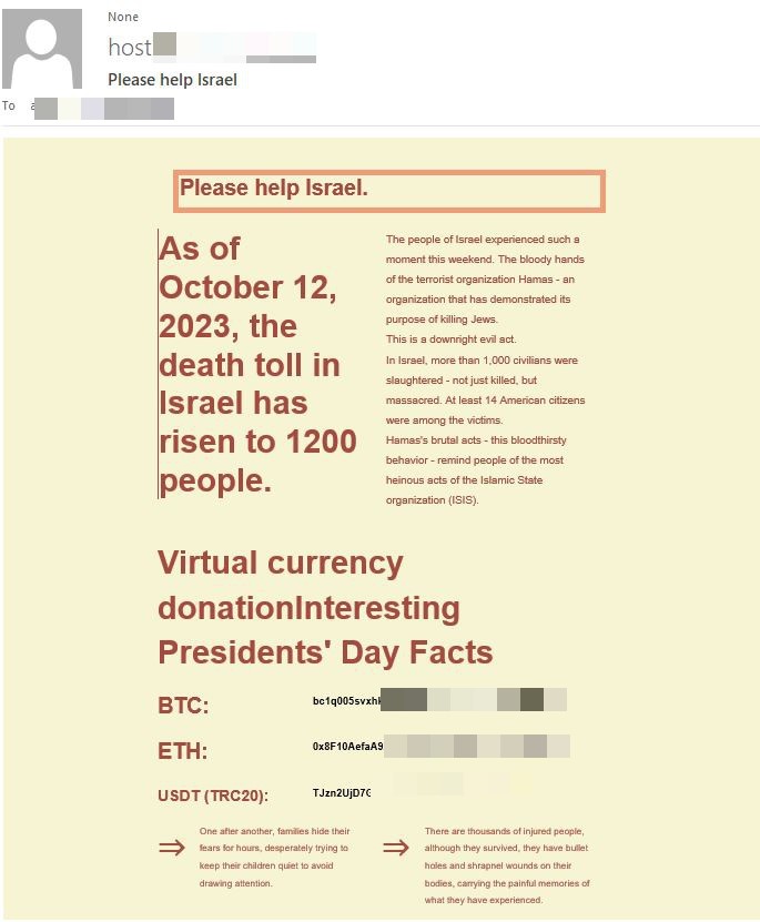 Hacker beobachten das Weltgeschehen und starten ihre Trittbrettfahreraktionen mit den ersten Nachrichten. Dieses auch vom Ausbruch des Ukraine-Krieges bekannte Muster wiederholt sich. Auch in der aktuellen Situation locken die Angreifer ihre Opfer mit vermeintlichen Spendenaufrufen oder Hilferufen israelischer oder palästinensischer Opfer in die Falle.