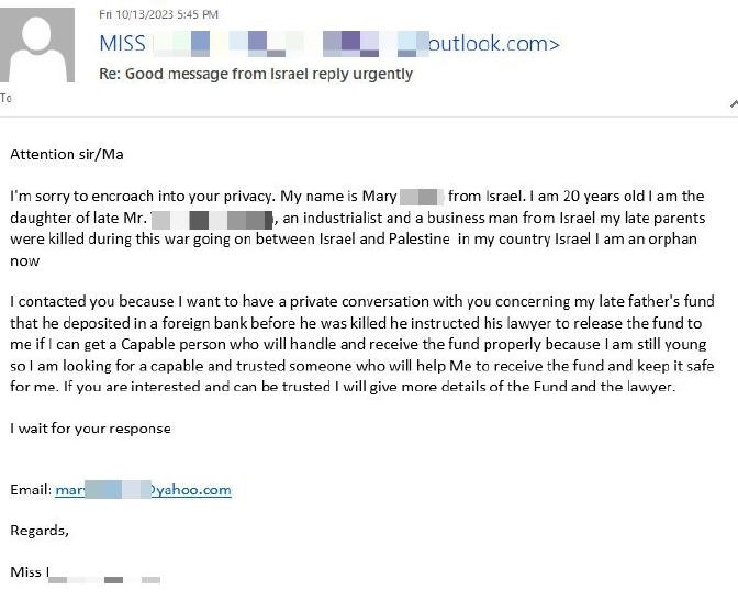 Abbildung 4: Bitte für Hilfe bei einem Fond des vermeintlich verstorbenen Vaters.