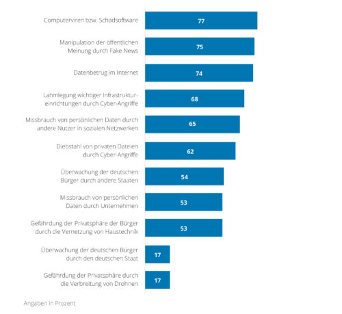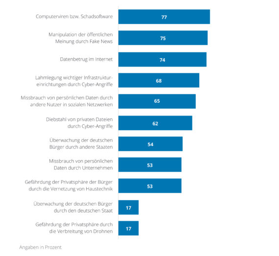 Als größtes Risiko werden von den Top-Entscheidern aktuell Computerviren beziehungsweise Schadsoftware wahrgenommen. 77 Prozent gaben das an. Damit ist der Anteil der Führungskräfte, die darin eine große Gefahr sehen, seit 2013 von 57 Prozent um 20 Prozentpunkte gewachsen. Auch die Manipulation der öffentlichen Meinung durch Fake-News (75 %) und Datenbetrug im Internet (74 %) werden als weitere große Gefahren gesehen. Dabei ist auffällig, dass auch die Zahl derjenigen, die Fake-News als Bedrohung ansehen, stetig zunimmt. 2017 sahen noch 67 Prozent dies als Risiko an. In der Liste der Cyber-Risiken folgen die Lahmlegung wichtiger Infrastruktureinrichtungen durch Cyber-Angriffe (68 %) sowie der Missbrauch von persönlichen Daten durch andere Nutzer in sozialen Netzwerken (65 %).