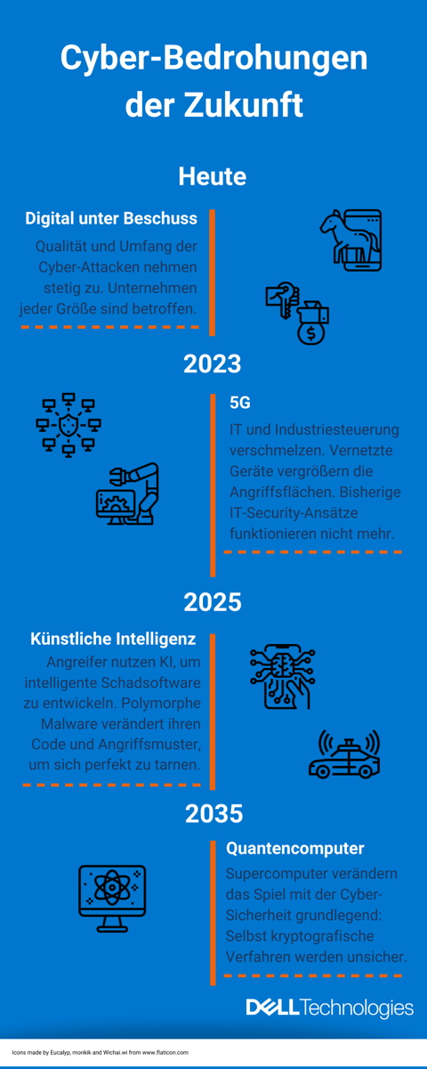 Deutsche Unternehmen stehen unter digitalem Dauerbeschuss. Egal, ob Großkonzern oder Mittelständler: Qualität und Umfang der Cyber-Attacken haben in der Vergangenheit ständig zugenommen. Das wird sich auch in Zukunft nicht ändern. Ganz im Gegenteil: Die Hacker werden neue Technologien geschickt zu nutzen wissen, um ihr Handwerk weiter zu perfektionieren. Dell Technologies zeigt auf, welche neuen Cyber-Bedohungen in den nächsten Jahren auf die Unternehmen zukommen werden.