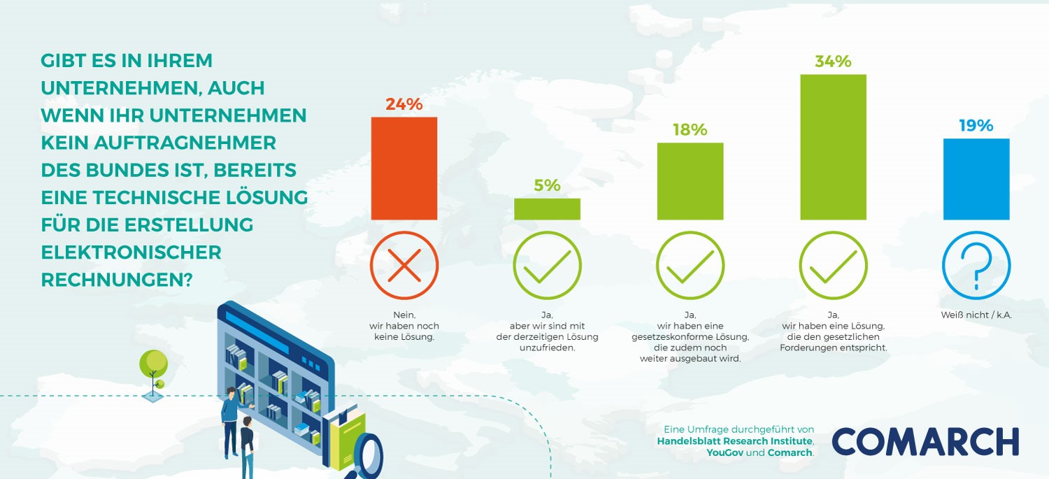 Etwa ein Drittel der befragten Unternehmen haben technische Lösungen zur Erstellung elektronischer Rechnungen, die den gesetzlichen Vorgaben entsprechen. Weitere 18 Prozent wollen darüber hinaus ihre bereits passenden Lösungen noch weiter ausbauen. Nur fünf Prozent sind mit ihrer derzeitigen Lösung unzufrieden. Jedoch verfügt rund ein Viertel der Unternehmen über keinerlei Lösung zur Erstellung elektronischer Rechnungen.