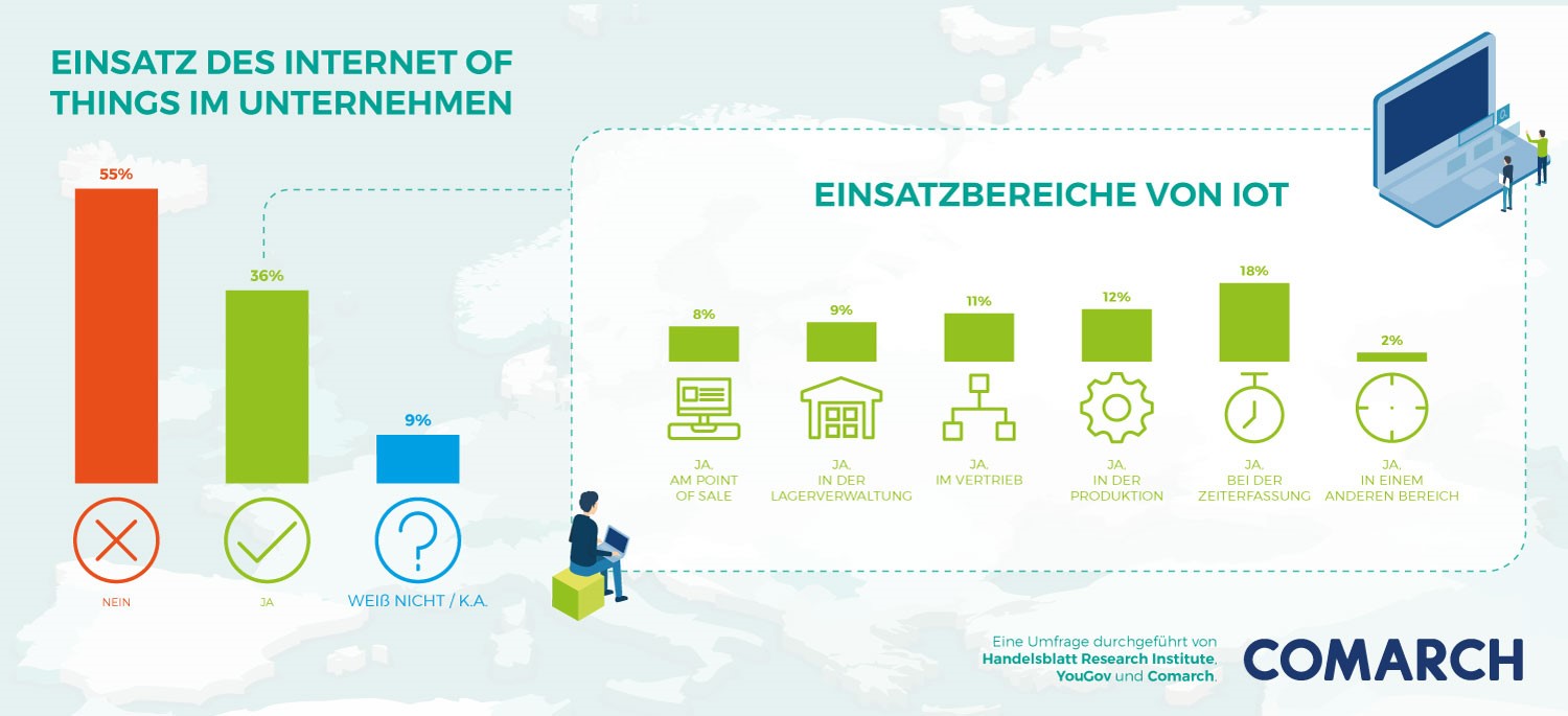 In der Befragung von Handelsblatt Research Institute, YouGov und Comarch wurde nun ermittelt, inwieweit IoT-Lösungen ganz allgemein bei 523 deutschen Unternehmen zum Einsatz kommen. Mehr als die Hälfte der Befragten (55 Prozent) nutzt keine IoT-Lösung. Bei den Unternehmen, die solche Lösungen nutzen, kommen sie am häufigsten im Bereich der Zeiterfassung zum Einsatz. Dies ist bei 18 Prozent der befragten Unternehmen der Fall. IoT-Lösungen kommen häufiger bei größeren Unternehmen zum Einsatz. Eine Branchenbetrachtung zeigt, dass IoT-Lösungen am häufigsten im Industriebereich (Produktion: Auto, Maschinen, Technologie, Sonstiges) zum Einsatz kommen, dort am ehesten in der Produktion. Direkt dahinter folgt der Finanzbereich in Sachen Einsatzhäufigkeit von IoT-Lösungen in den Unternehmen. Finanzunternehmen setzen solche Lösungen überwiegend für die Zeiterfassung ein. Relativ wenig Anwendung finden IoT-Lösungen bei Unternehmen aus dem Bereich Gesundheit und Pflege.