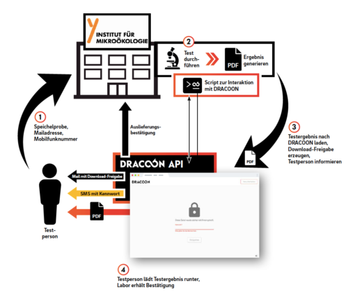 Bei der Speichelprobe gibt die Testperson ihre E-Mail-Adresse und eine Mobilfunknummer an. Nachdem der Test durchgeführt und ein Ergebnis generiert wurde, wird dieser Befund in DRACOON geladen. Sobald der Upload erfolgt, wird über das API von DRACOON automatisch zu jedem Testergebnis eine Download-Freigabe und ein zugehöriges Passwort generiert. Diese Download-Freigabe wird per E-Mail an die Testperson versandt, das Passwort wird aus Sicherheitsgründen auf einem gesonderten Kommunikationsweg per SMS zugestellt. Über diesen Link kann die Testperson unter Eingabe ihres Passworts ihr persönliches Untersuchungsergebnis sicher abrufen – und das in der Regel bereits am gleichen Tag. Parallel dazu erhält das Institut für Mikroökologie eine Auslieferungsbestätigung, dass das Testergebnis zugestellt wurde.