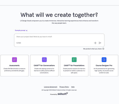 - KI-gestützte Content-Erstellung: Die Erstellung von Lerninhalten zählt oft zu den zeit- und ressourcenaufwendigsten Bereichen der Personalentwicklung. Skillsofts neues KI-Autorentool LX Design Studio™ verändert den Aufbau von Lernerfahrungen grundlegend. Unternehmen können damit innerhalb von Minuten individuelle CAISY™ Szenarien, Skill-Benchmarks und komplette Kurse generieren – bis zu fünfmal schneller als mit traditionellen Methoden und mit höherer didaktischer Qualität durch Übungen, die echte Szenarien im Arbeitsalltag nachstellen. Künftig wird es Organisationen möglich sein, bestehende Inhalte zu personalisieren und sie direkt in den Arbeitsablauf zu integrieren. So wird das Lernen schneller, intelligenter und wirkungsvoller.