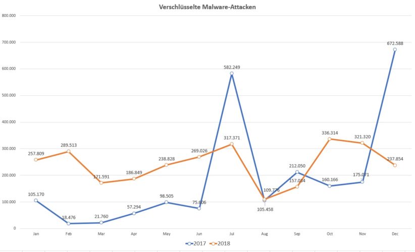 - Im Jahr 2018 wurden mehr als 2,8 Millionen verschlüsselte Malware-Angriffe blockiert. Das entspricht einem Zuwachs von 27 Prozent gegenüber dem Vorjahr.